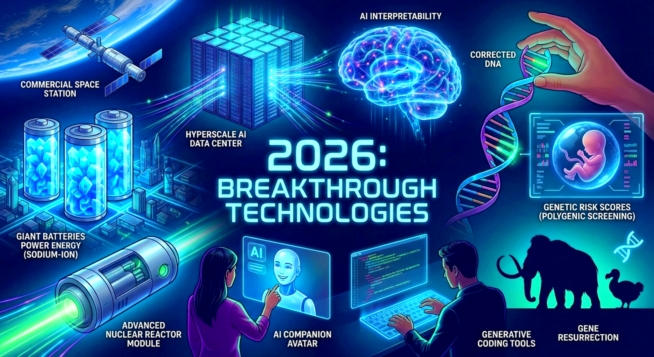 تتميز قائمة هذا العام بمزيج فريد يجمع بين الحلول البيئية الملحة، والقفزات الجريئة في مجال الذكاء الاصطناعي، والتدخلات البيولوجية العميقة التي تلامس جوهر الحياة. من بطاريات الملح الزهيدة الثمن إلى إحياء الجينات المنقرضة، ومن رفقاء الذكاء الاصطناعي إلى محطات الفضاء التجارية. وتبرز قائمة “إم آي تي تكنولوجي ريفيو” لعام 2026 تحولًا محوريًا في مسار التكنولوجيا؛ فلم نعد نتحدث فقط عن “الرقمنة”، بل عن “التجسيد” و”التدخل العميق”. من ناحية الطاقة، نرى تحولًا نحو الواقعية الاقتصادية والحلول الجذرية. في الذكاء الاصطناعي، انتقل التركيز من الانبهار بالقدرات إلى محاولة الفهم (التفسير الميكانيكي) والتعايش العاطفي والبناء الضخم (مراكز البيانات). أما بيولوجيًا، فقد كسرنا حاجز الطبيعة، سواء بتصميم الأجنة، أو العلاج الجيني الفردي، أو حتى محاولة عكس مسار الانقراض، ونستعرض في هذا التقرير الصحفي العلمي المفصل هذه التقنيات العشر، محللين أبعادها العلمية وتأثيراتها المتوقعة.
